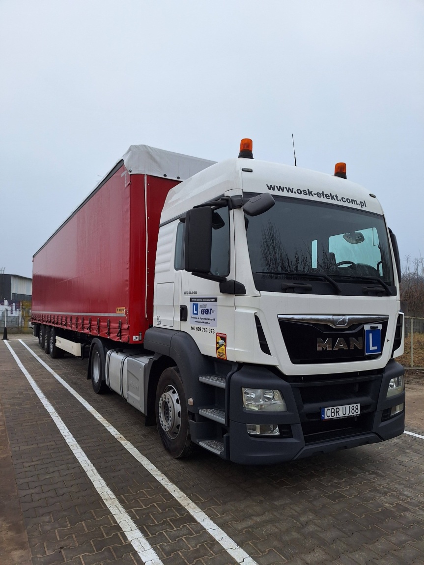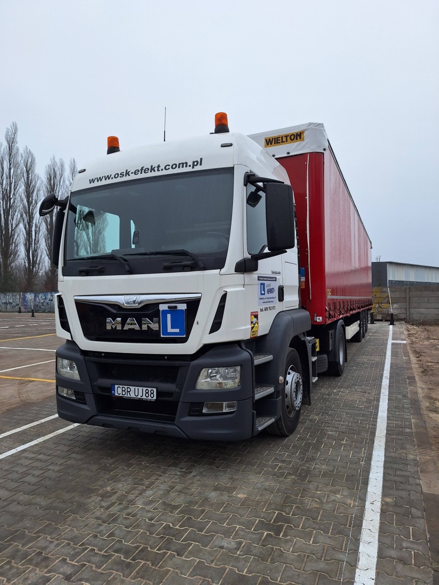 Szkolenie odbywa się pojazdem MAN TGS 18.400 + naczepa WIELTON jak na egzaminie państwowym w Grudziądzu